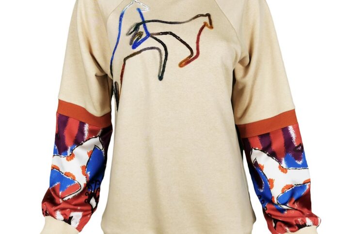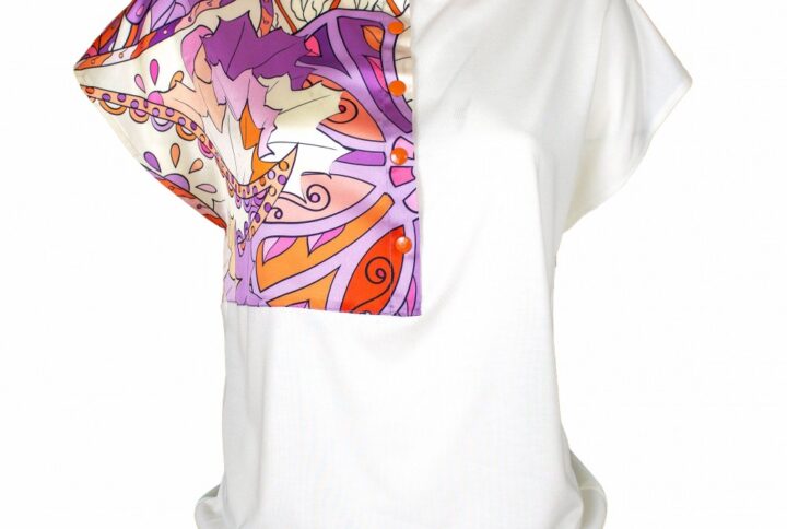 The applique of the t-shirt is the same fabric as our “Wide Pleated Pants In Abstract Print Linen” and “Linen Tiered Drawstring Skirt With Trims Of Lace Appliques”.