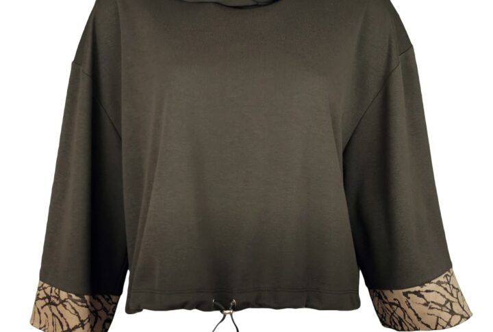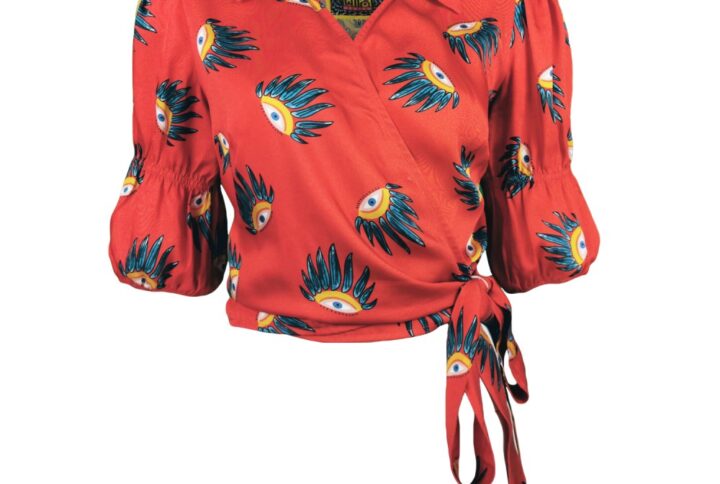 A wrap-style v neck. The back is slightly longer than the front and the elastic on the back waist provides ease of wear and removes your body lines. The bow tie on the front also adds elegance.